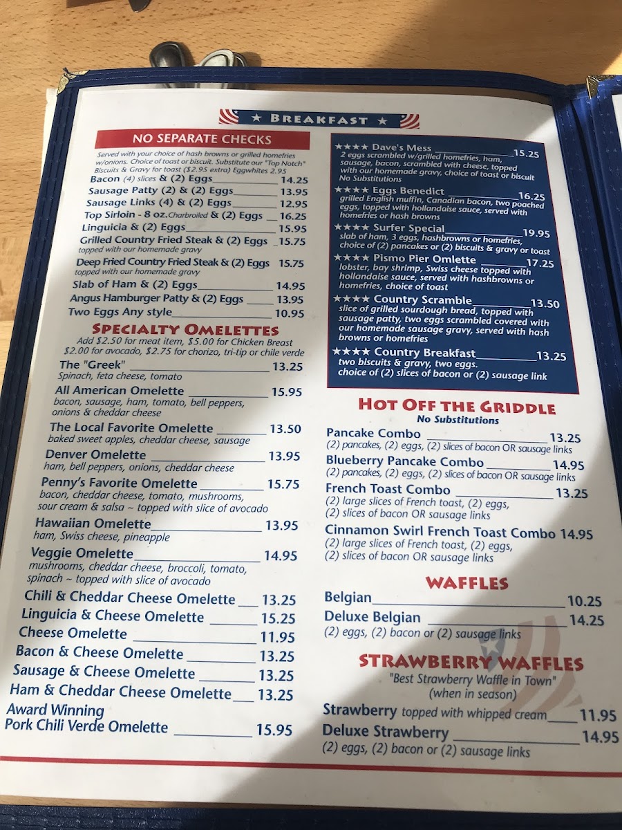 Welcome to Penny's All American Cafe, a delightful breakfast haven nestled in Pismo Beach. Known for its hearty, home-cooked flavors, Penny's menu is a tribute to traditional American comfort food. Start your day with a variety of mouthwatering options such as the classic Pancake Combo or the decadent Cinnamon Swirl French Toast—each dish arrives hot off the griddle, bursting with flavor.